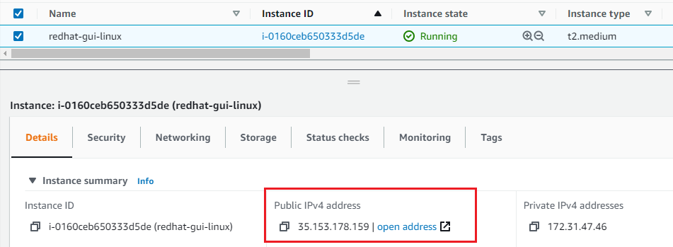 - On the EC2 Console page, instance is up and running. To connect to this instance through putty, copy the IPv4 Public IP Address